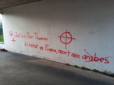 அதில், அண்மையில் இரவுக் கேளிக்கை விருந்தில் உள்நுழைந்தவர்களால் கத்திக்குத்திற்கு இலக்காகி சாவடைந்த 16 வயதுடைய தொமாவிற்கு நீதி கோரி «தொமாவிற்கு நீதி வேண்டும் - இங்கு நாங்கள் வாழ்வது பிரான்ஸ் - அராப்களைக் கொல்வோம்» என்ற வாசகங்களும் சிவப்பு பொறிக்கப்பட்டிருந்தன.