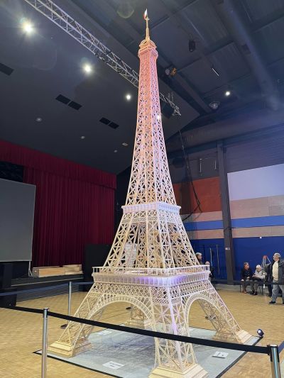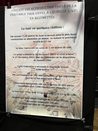 Charente-Maritime நகரில் வசிக்கும் Richard Plaud எனும் நபர் ஒருவர், கடந்த எட்டு ஆண்டுகளாக செயற்பட்டு 7.20 மீற்றர் உயரம் கொண்ட ஈஃபிள் கோபுரம் ஒன்றை தீக்குச்சிகளினால் உருவாக்கியுள்ளார். இரும்பு பெண்மணி என அழைக்கப்படும் ஈஃபிள் தற்போது பொஸ்பரஸ் ஆடை அணிந்துள்ளது.
