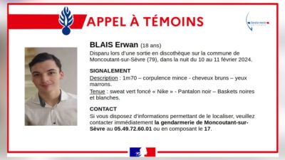 கடந்த 11ம் திகதியிலிருந்து Deux-Sèvres இலுள்ள Moncoutant-sur-Sèvre இல் ஏர்வான் (Erwan) எனும் 18 வயது இளைஞன் காணாமற்போயுள்ளார்.