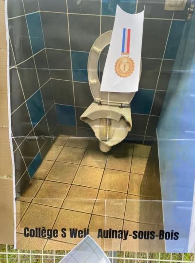 Aulnay-sous-Bois நகரில் உள்ள பாடசாலை ஒன்றின் கழிவறை இருக்கை உடைந்து பயன்படுத்த முடியாத நிலையில் இருக்கிறது.