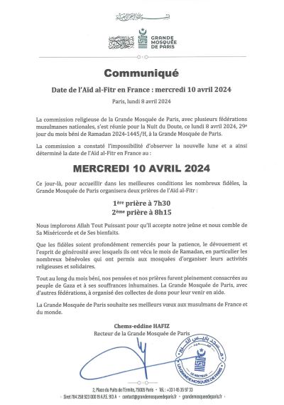 புனித ரமழான் பெருநாள் வரும் ஏப்ரல் 10, புதன்கிழமை கொண்டாடப்பட உள்ளதாக பரிஸ் பெரிய பள்ளிவாசல் அறிவித்துள்ளது.