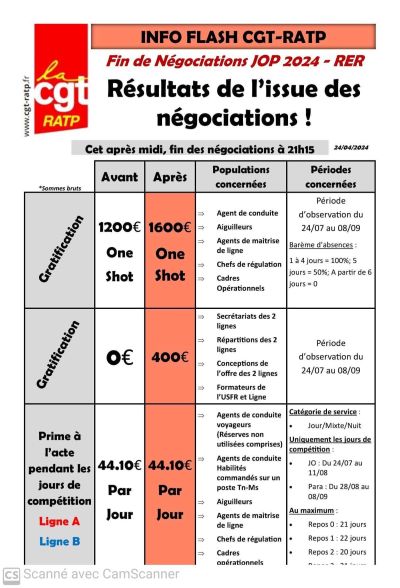 தொழிற்சங்கம் மற்றும் RATP தொடருந்து நிறுவனத்துக்கும் இடையே இடம்பெற்ற பேச்சுவார்த்தையில் இந்த தீர்மானம் எட்டப்பட்டுள்ளது. நேற்று ஏப்ரல் 24 ஆம் திகதி புதன்கிழமை மாலை FO, CGT உள்ளிட்ட தொழிற்சங்கங்களுக்கும் RATP அதிகாரிகளுக்கும் இடையே பேச்சுவார்த்தை இடம்பெற்றது. அதன்முடிவில், சாரதிகளுக்கு ஊக்கத்தொகை வழங்குவதற்கு தீர்மானம் எட்டப்பட்டுள்ளது.