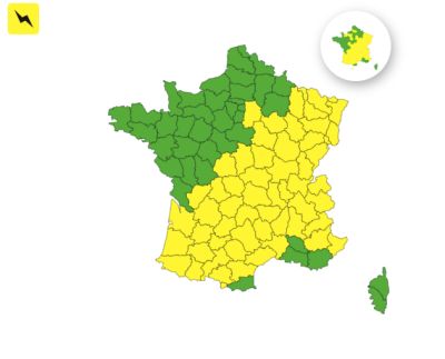 Pyrénées-Atlantiques, Landes, Bas-Rhin, Moselle. Le sud-est - Alpes-Maritimes, Drôme, Gard, centre, Cher, Vaucluse, Bouches-du-Rhône, Var, Pyrénées-Orientales, Corse ஆகியவற்றின் 55 மாவட்டங்களில் கடுமையான கல் மழை மற்றும் கடுமையான காற்றும் வீசும் என எச்சரிக்கப்பட்டுள்ளது.