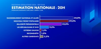 Rassemblement National கட்சி எதிர்பார்த்தபடியே அதிகூடிய இடங்களைகைப்பற்றியுள்ளது. 34% சதவீத வாக்குகளை அது பெற்றுள்ளதாகவும், Nouveau Front Populaire கூட்டணிகள் 29% சதவீத வாக்குகளையும், மக்ரோனின் மறுமலர்ச்சி கட்சி 22% சதவீத வாக்குகளையும் பெற்றுள்ளது.