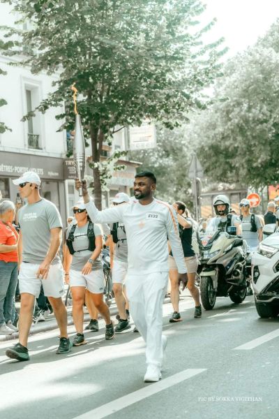 ஜூலை 14 மற்றும் 15 ஆம் திகதிகளில் ஒலிம்பிக் தீபம் பரிஸ் முழுவதும் கொண்டுசெல்லப்பட்டது. இந்த இரண்டு நாட்களிலும் மொத்தமாக 344 பேர் அதனை சுமந்து சென்றிருந்தார்கள். அவர்களில் ஈழத்தமிழர் தர்சனும் ஒருவர்.