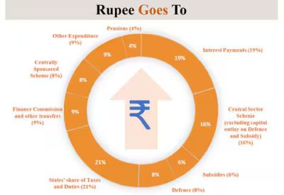 அதேபோல், வட்டி கட்டுவதற்காக 19 சதவீதமும், மாநிலங்களுக்கான வரி பகிர்வுக்காக 21 சதவீதமும், மத்திய அரசின் திட்டங்களுக்காக 16 சதவீதமும், நிதி குழு ஒதுக்கீடுகள் மற்றும் இதர செலவினங்களுக்காக தலா 9 சதவீதமும், பாதுகாப்புத்துறை, மத்திய நிதியுதவி திட்டங்களுக்காக தலா 8 சதவீதமும், மானியங்களுக்காக 6 சதவீதமும், ஓய்வூதியத்திற்காக 4 சதவீதமும் செலவாவதாக தெரிவிக்கப்பட்டுள்ளது.