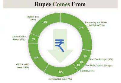 இதில், கடன்கள் மற்றும் பிற சொத்துகள் மூலமாக 27 சதவீதமும், வருமான வரி மூலமாக 19 சதவீதமும், ஜி.எஸ்.டி மற்றும் இதர வரிகள் மூலமாக 18 சதவீதமும், வர்த்தக வரி மூலமாக 17 சதவீதமும், வரி அல்லாத ரசீதுகள் மூலமாக 9 சதவீதமும், தொழிற்சங்க கலால் வரிகள் மூலமாக 5 சதவீதமும், சுங்க வரிகள் மூலமாக 4 சதவீதமும், கடன் அல்லாத மூலதன ரசீதுகள் மூலமாக ஒரு சதவீதமும் வருவாய் மத்திய அரசுக்கு கிடைக்கிறது.