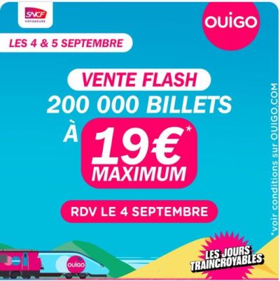 19 யூரோக்களுக்கு Ouigo பயணச்சிட்டைகளை பெற்றுக்கொள்வதற்கான வசதி ஒன்றினை SNCF அறிவித்துள்ளது.
