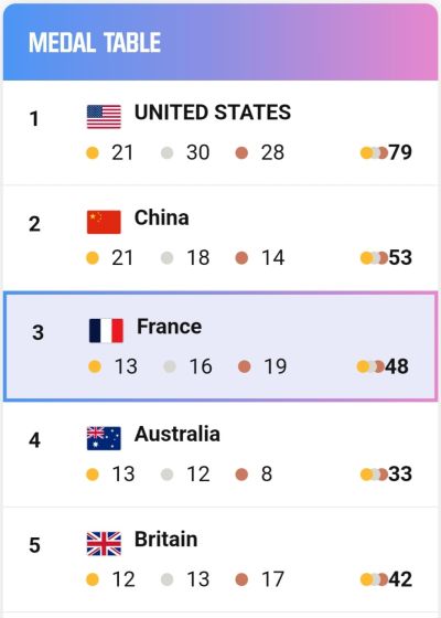 நேற்று ஓகஸ்ட் 5, திங்கட்கிழமை நாள் முடிவில் 13 தங்கங்கள் உள்ளடங்கலாக மொத்தமாக 48 பதக்கங்களுடன் மூன்றாவது இடத்தில் உள்ளது.
