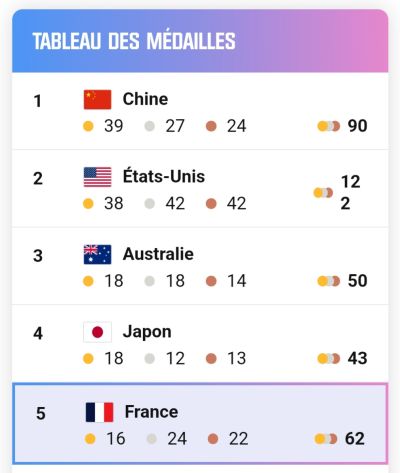 பிரான்ஸ் நாள் முடிவில் 16 தங்கம், 24 வெள்ளி, 22 வெண்கலப்பதக்கங்களுடன் மொத்தமாக 62 பதக்கங்களைப் பெற்று பட்டியலில் ஐந்தாவது இடத்தில் உள்ளது.