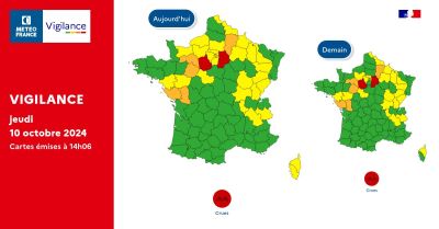 இன்று பிற்பகல் 2 மணியில் இருந்து நாளை ஒக்டோபர் 11, வெள்ளிக்கிழமை காலை வரை இந்த எச்சரிக்கை விடுக்கப்படுவதாகவும், பொதுமக்கள் மிகுந்த விழிப்புடன் இருக்கும்படியும் Météo France அறிவுறுத்தியுள்ளது. Seine-et-Marne மாவட்டத்துக்கு இன்று இரண்டாவது நாளாக சிவப்பு எச்சரிக்கை விடுக்கப்பட்டுள்ளது. அதேவேளை, Orne, Sarthe, Deux-Sèvres, Vendée மற்றும் Aisne ஆகிய ஐந்து மாவட்டங்களுக்கு செம்மஞ்சள் எச்சரிக்கை விடுக்கப்பட்டுள்ளது.