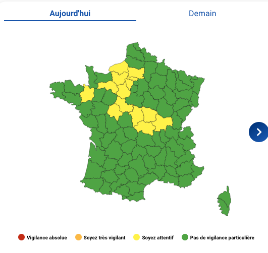 Allier, Cher, Eure, Eure-et-Loir, Ille-et-Vilaine, Indre-et-Loire, Loir-et-Cher, Nièvre, Oise, Orne, Saône-et-Loire, Seine-Maritime, Yvelines மற்றும் Val-D'Oise ஆகிய 14 மாவட்டங்களுக்கு வெள்ளம் காரணமாக ‘மஞ்சள்’ நிற எச்சரிக்கை விடுக்கப்பட்டுள்ளது.