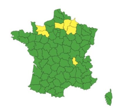 அம்மாவட்டங்களுக்கு குறைந்தபட்ச எச்சரிக்கையான ‘மஞ்சள்’ நிற எச்சரிக்கையினை Météo-France விடுத்துள்ளது.