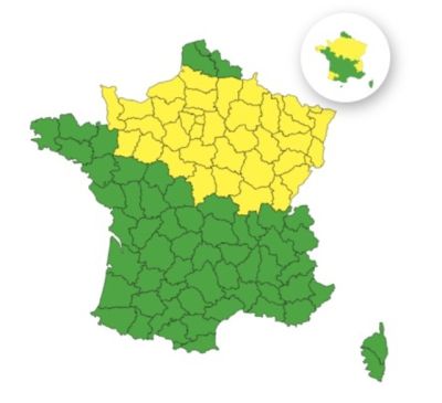 தலைநகர் பரிஸ், இல் து பிரான்சின் அனைத்து மாவட்டங்களுடன், Aisne, Ardennes, Aube, Calvados, Cher, Côte-d'Or, Doubs, Eure, Eure-et-Loir, Jura, Loir-et-Cher, Loiret, Manche, Marne, Haute-Marne, Mayenne, Meurthe-et-Moselle, Meuse, Moselle, Nièvre, Oise, Orne, Bas-Rhin, Haut-Rhin, Haute-Saône, Saône-et-Loire, Sarthe, Paris, Seine-Maritime, Seine-et-Marne, Yvelines, Somme, Vosges, Yonne, Territoire de Belfort, Essonne, Hauts-de-Seine, Seine-Saint-Denis, Val-de-Marne மற்றும் Val-d'Oise ஆகிய 40 மாவட்டங்களுக்கு மஞ்சள் நிற எச்சரிக்கை விடுக்கப்பட்டுள்ளது.