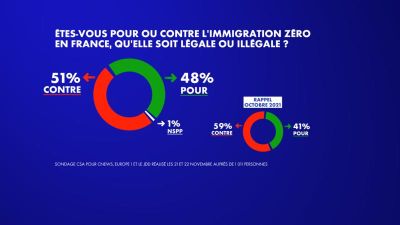 CNEWS மற்றும் Euope 1 ஆகிய ஊடகங்களுக்காக CSA நிறுவனம் கருத்துக்கணிப்பு ஒன்றை மேற்கொண்டிருந்தது. அதில் “நீங்கள் பிரான்சில் எவ்வித சட்டவிரோதமாகவோ, சட்டபூர்வமாகவோ குடியேற்றத்துக்கு எதிராக இருக்கின்றீர்களா..?” என கேட்கப்பட்ட கேள்விக்கு, 48% சதவீதமாக மக்கள் “குடியேற்றத்துக்கு எதிராக இருக்கிறேன்” எனவும், 51% சதவீதமானவர்கள் “குடியேற்றத்துக்கு ஆதரவாக இருக்கிறேன்” எனவும், 1% சதவீதமானவர்கள் கருத்து எதுவும் தெரிவிக்க விரும்பவில்லை எனவும் தெரிவித்துள்ளனர்.