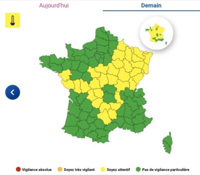 Ardennes, Aube, Aveyron, Cantal, Cher, Corrèze, Côte-d'Or, Creuse, Doubs, Indre, Jura , Loir-et-Cher, Loire, Haute-Loire, Loire-Atlantique, Loiret, Lozère, Marne, Haute-Marne, Meurthe-et-Moselle, Meuse, Moselle, Nièvre, Nord, Bas-Rhin, Haut-Rhin, Haute-Saône, Saône-et-Loire, Deux-Sèvres, Vendée, Vienne, Haute-Vienne, Vosges ம்ற்றும் Yonne ஆகிய மாவட்டங்களுக்கு கடும் குளிர் காரணமாக ‘மஞ்சள்’ எச்சரிக்கை விடுக்கப்பட்டுள்ளது.