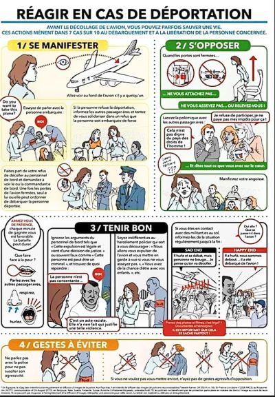 குடியேற்றத்துக்கு ஆதரவான அமைப்பினரே இந்த பிரச்சாரத்தில் ஈடுபட்டனர். விமான நிலையத்தில் வைத்து பயணிகளிடன் துண்டு பிரசுரங்கள் வழங்கி Obligation de Quitter le Territoire Français சட்டம் தொடர்பில் விளக்கமளித்து, அதற்கு எதிர்ப்பு தெரிவித்தனர்.
