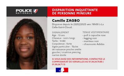 Camille ZAGBO எனும் சிறுமியே காணாமல் போனதாகவும், Yvelines மாவட்டத்தின் La Celle-Saint-Cloud நகரைச் சேர்ந்தவர் எனவும் தெரிவிக்கப்படுகிறது. சென்ற ஞாயிற்றுக்கிழமையில் இருந்து அவரைக் காணவில்லை எனவும், அவர் தொடர்பில் தகவல் அறிந்தவர்கள் உடனடியாக தொடர்புகொள்ளுமாறும் காவல்துறையினர் கோரியுள்ளனர்.