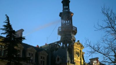 தீப்பிழம்பினால் பாதிக்கப்பட்ட மணிக்கூண்டு இடிந்துவிழும் அபாயத்தில் உள்ளது.