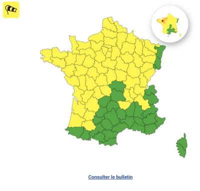 l’Aisne, les Ardennes, l’Aube, le Calvados, la Charente, la Charente-Maritime, le Cher, des Côtes-d’Armor, la Creuse, la Dordogne, l’Eure, l’Eure-et-Loire, le Finistère, la Haute-Garonne, le Gers, la Gironde, l’Ille-et-Vilaine, l’Indre, l’Indre-et-Loire, les Landes, le Loir-et-Cher, la Loire-Atlantique, le Loiret, le Lot-et-Garonne, le Maine-et-Loire, la Manche, la Marne, la Mayenne, la Meurthe-et-Moselle, la Meuse, le Morbihan, la Moselle, la Nièvre, le Nord, l'Oise, l’Orne, le Pas-de-Calais, les Pyrénées-Atlantiques, les Hautes-Pyrénées, la Sarthe, Paris, la Seine-Maritime, la Seine-et-Marne, les Yvelines, les Deux-Sèvres, la Somme, la Vendée, la Vienne, la Haute-Vienne, l’Yonne, l’Essonne, les Hauts-de-Seine, la Seine-Saint-Denis, le Val-de-Marne le Val-d’Oise ஆகிய மாவட்டங்களிற்கு இந்த எச்சரிக்கை விடுக்கப்பட்டுள்ளது.