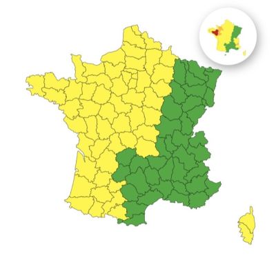 Aisne, Allier, Ardennes, Ariège, Aube, Calvados, Charente, Charente-Maritime, Cher, South Corsica, Haute-Corse, Côtes-d'Armor, Creuse, Dordogne, Eure, Eure-et-Loir, Finistère, Haute-Garonne, Gers, Gironde, Ille-et-Vilaine, Indre, Indre-et-Loire, Landes, Loir-et-Cher, Loire-Atlantique, Loiret, Lot-et-Garonne, Maine-et-Loire, Manche, Marne, Mayenne, Morbihan, Nièvre, Nord, Oise, Orne, Pas-de-Calais, Puy-de-Dôme, Pyrenees-Atlantiques, Hautes-Pyrenees, Sarthe, Paris, Seine-Maritime, Seine-et-Marne, Yvelines, Deux-Sèvres, Somme, Tarn-et-Garonne, Vendée, Vienne, Haute-Vienne, Yonne, Essonne, Hauts-de-Seine, Seine-St-Denis, Val-de-Marne மற்றும் Val-d'Oise ஆகிய மாவட்டங்களுக்கே எச்சரிக்கை விடுக்கப்பட்டுள்ளது.