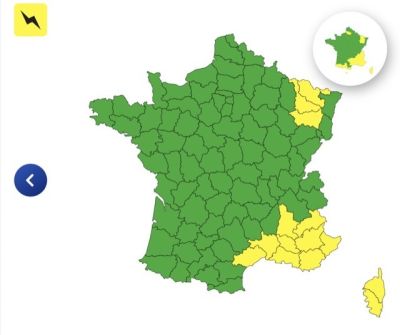 பிரான்சில் கிழக்கு மாவட்டங்கள் தென்கிழக்கு மாவட்டங்களான Moselle, Meurthe-et-Moselle, Vosges, Hautes-Alpes, Drôme, Hérault, Gard, Bouches-du-Rhône, Var, Vaucluse, Alpes-de-Haute-Provence, Alpes-Maritime, Haute-Corse மற்றும் Corse-du-Sud ஆகிய 14 மாவட்டங்களுக்கு எச்சரிக்கை விடுக்கப்பட்டுள்ளது.
