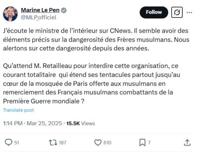 அதை அடுத்து, Rassemblement national கட்சித்தலைவரும், வழக்கறிஞருமான மரீன் லு பென், “அனைத்து இஸ்லாமிய அமைப்புகளையும் தடை செய்ய வேண்டும்” என உள்துறை அமைச்சர் Bruno Retailleau இடம் கோரிக்கை வைத்துள்ளார்.