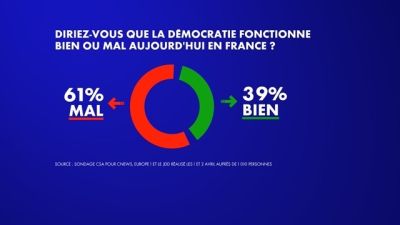 CNEWS, JDD மற்றும் Europe 1 போன்ற ஊடகங்களுக்காக மேற்கொள்ளப்பட்டிருந்த இந்த கருத்துக்கணிப்பில் “பிரான்சில் ஜனநாயகம் சிறப்பாக இருக்கிறதா..? நன்றாக செயற்படுகிறதா?” எனும் கேள்வி எழுப்பப்பட்டது. இதில் பங்கேற்றவர்களில் 61% சதவீதமானவர்கள் “பிழையாக செயற்படுகிறது” என தெரிவித்துள்ளனர். ஏனைய 39% சதவீதமானவர்கள் “நன்றாக செயற்படுகிறது” என தெரிவித்துள்ளனர்.