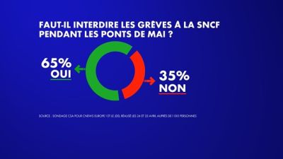மே மாதத்தின் விடுமுறைநாட்களுடன் இணைந்து வரும் வார இறுதிகளில் (pont) SNCF ஏற்கனவே அறிவித்துள்ள பணிப்புறக்கணிப்பைத் தடை செய்ய வேண்டுமா என CSA ஊடகங்களிற்காக ஒரு கருத்துக் கணிப்பைச் செய்துள்ளது.