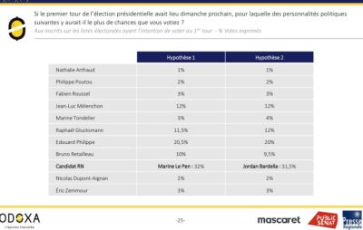 ஆனாலும் பிரபல தேர்தல் புள்ளிவிபர நிபுணர்களான ஒதெக்ஸா (ODEXA) மஸ்கெராவுடன் இணைந்து Public Sénatஎனும் பத்திரிகைக்காக ஒரு புள்ளிவிபரத்தை எடுத்துள்ளது.