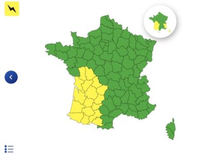 ஏப்ரல் 14, நாளை திங்கட்கிழமை இந்த எச்சரிக்கை விடுக்கப்பட்டுள்ளது. Ariège, Charente, Charente-Maritime, Corrèze, Dordogne, Haute-Garonne, Gers, Gironde, Landes, Lot, Lot-et-Garonne, Pyrénées-Atlantiques, Hautes-Pyrénées, Deux-Sèvres, Tarn-et-Garonne, Vienne மற்றும் Haute-Vienne ஆகிய 17 மாவட்டங்களில் பலத்த மழையும், பல இடங்களில் வெள்ளப்பெருக்கு ஏற்படும் எனவும் தெரிவிக்கப்பட்டு அங்கு 'மஞ்சள்' நிற எச்சரிக்கை விடுக்கப்பட்டுள்ளது.