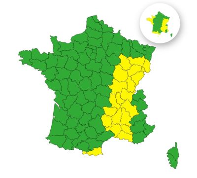 Ain, Ardèche , Bouches-du-Rhône, Côte-d'Or, Doubs, Gard, Isère, Jura, Loire, Haute-Loire, Lozère, Haute-Marne, Pyrénées-Orientales, Haut-Rhin, Rhône, Haute-Saône, Saône-et-Loire, Vaucluse, Vosges மற்றும் Territoire de Belfort ஆகிய மாவட்டங்களுக்கு மஞ்சள் நிற எச்சரிக்கை விடுக்கப்பட்டுள்ளது.