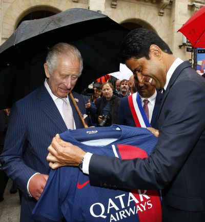 எனத் தெரிவித்த நாசர் அல்-செலெய்பி ( Nasser Al-Khelaïfi) தன் கைகளாலேயே PSG ஆடையயை பிரித்தானிய மன்னரிற்கு வழங்கினார்.